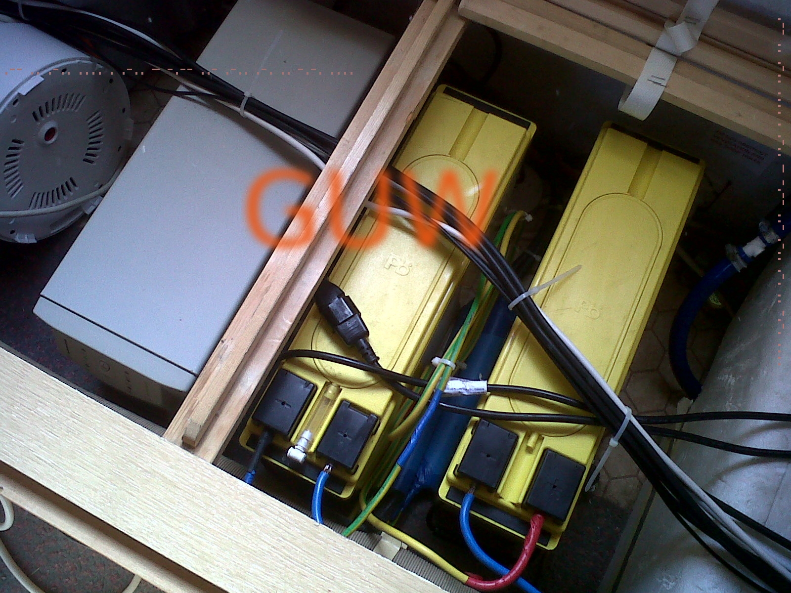 The photo shows an inverter (grey) and two 12V batteries (yellow) that I installed in my caravan to keep the television and satellite recorder going even if the mains cable was accidentally pulled out. As an aside and additional to my discussion on batteries in the previous section, this particular type are known as AGM (absorbent glass mat). They are lead/acid but, as the name suggests, the acid is absorbed in fine glass matting and won't leak out even if the battery is turned upside-down. They are expensive but I'll admit that I didn't buy them new. Another advantage is that, although they are vented to the atmosphere, they produce virtually no gases when charging, very reassuring as they are under my bed! The inverter is the type known as a UPS (uninteruptable power supply) which are widely used to keep a computer going if the mains fails. This particular one is 24V DC so the two batteries are connected in series to give the correct voltage. When the mains is connected the batteries are kept charged and then, if it fails, the equipment keeps running until the batteries are exhausted (not recommended to let the situation get that far). This particular set-up will keep the TV and satellite receiver going for about a day.