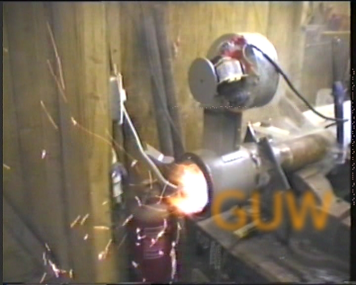 Here is one of my early designs of burner under test. It was all rather exciting because I had to wind the auger with one hand and operate the video-camera with the other. This was all in a wooden shed too but not quite as bad as it looks. Note the fire-extinguisher behind the burner, how would I have got to that? After all the work, if something had gone wrong I think I would have rescued the burner and left the video-camera and shed behind!