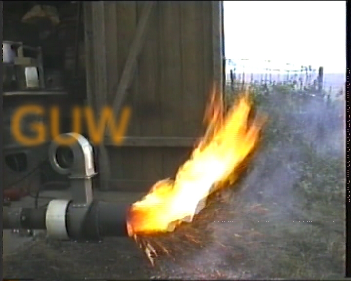 Another photo of the same stoker-burner but after the burner-head had been modified. The burner-head was the most difficult part to get right as the correct airflow is critical. More sophisticated units, including my updated version, have reflective (refractory) substance surrounding the inside of the burner-head. This makes a hotter and more efficient combustion zone. The idea is to have a small but very intense fire so all of the fuel and gases are burnt cleanly. Note that there is no smoke from the burner itself, just from some grass and ash on the ground. See U-Tube video here.