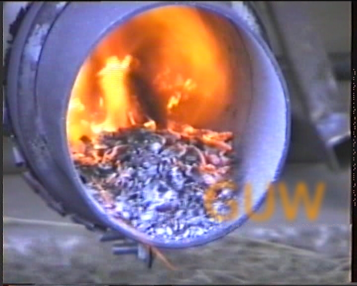 This is the view into the burner-head once the fuel has been stopped and the flames have died down. The flames do not just shoot out horizontally from the tube but rise vertically and curve over towards both sides of the tube and then exit nearer the top. The partly combusted wood can be seen at the bottom, there is no need for any mechanism to remove the ash as this naturally falls from the end of the tube under the action of the hot gases. Roughly 200 litres of wood-chips will last about 10 hours and will easily heat a medium sized house. All that is left afterwards is 1-2 litres of very fine ash for the garden.