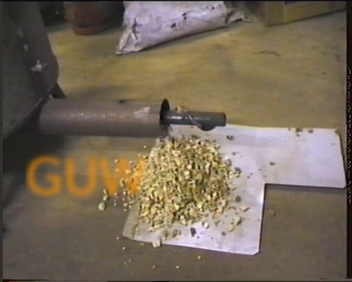 Here is the oil-drum in place with the finished auger-system under test. Once something has been finished it can be rather mesmeric to sit and watch it working, many hours can be lost this way and this was no exception. It had taken so long to perfect the unit that I couldn't really believe it was all working however, when I had to clear-up the pile of wood-chips on the floor I was quickly returned to reality!