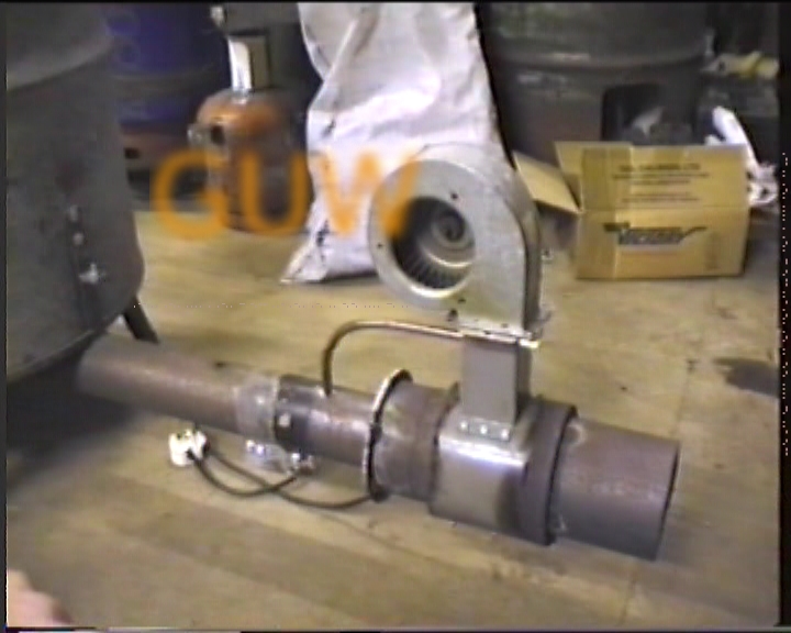 Here is the finished burner-head fitted onto the fuel-tube. The fan is a centrifugal type taken from a cooker (scrap-man again) and you can see the 3/8 inch copper (10mm) pipe that carries air to the fuel-tube. Actually, I found that 10mm was too small and later changed it to 22mm (7/8 inch).