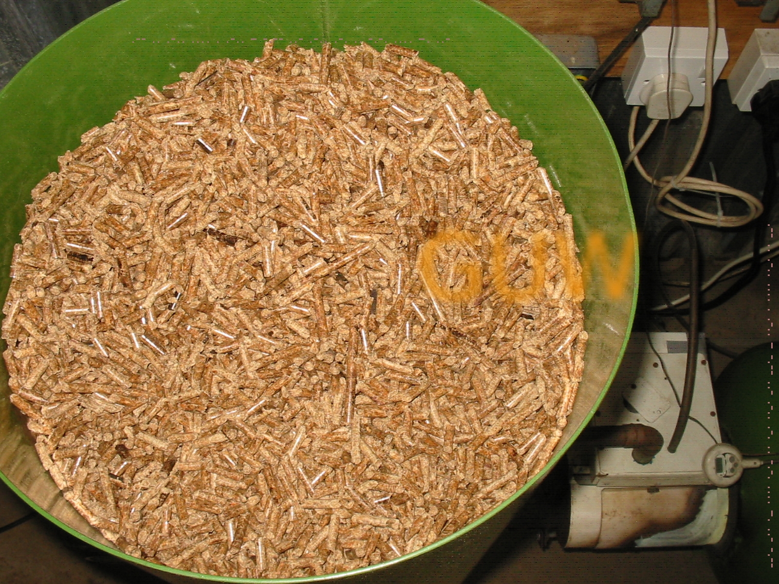 Here is a hopper full of wood-pellets. These are much less bulky and easier to use than wood-chips because they flow more like a liquid. They are more expensive but, if you want to be 'green', they are equally as environmentally-friendly as wood-chips because they are often made from the scrap wood that would have been thrown away from other industrial processes.