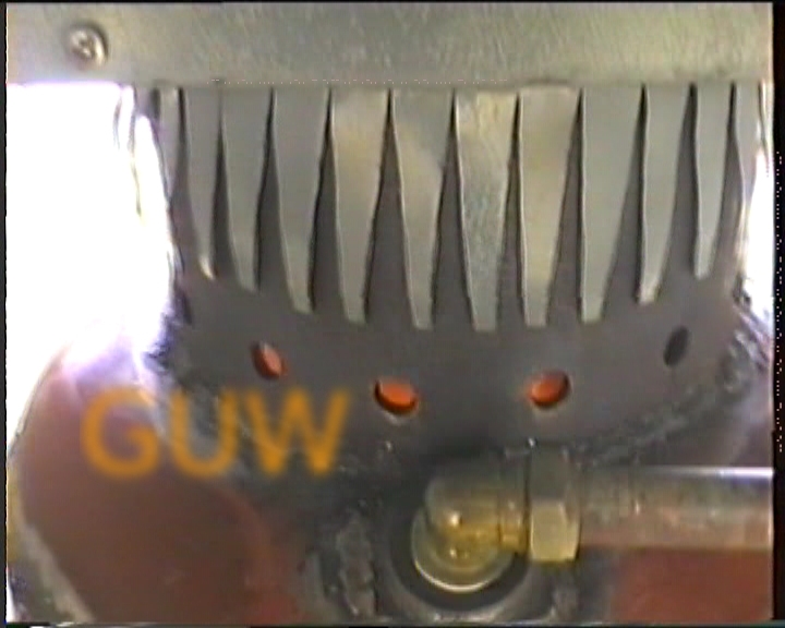 The gasifier in the photo is designed to burn the gas almost immediately it is produced and through the holes it is possible to see the gas alight. The gas burner here works in the opposite way to a gas ring on a cooking hob as air is drawn in through the holes (secondary air) to combust the gas.