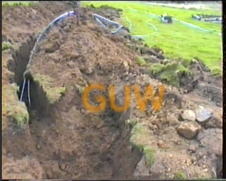 These are the pipes going into the ground for the ground-source heat-pump (I'm sure I have a better picture somewhere, I'll replace this one when I find it). In my system I have 400 metres of pipe at a depth of 2 metres (the pipes must be well below the frost line). The longer the pipes, the more heat you can take from the ground. There are 6 loops in total, 2 in each of 3 trenches. Each loop is joined onto the next so the water must travel the full length of pipe before in returns to the heat-pump.