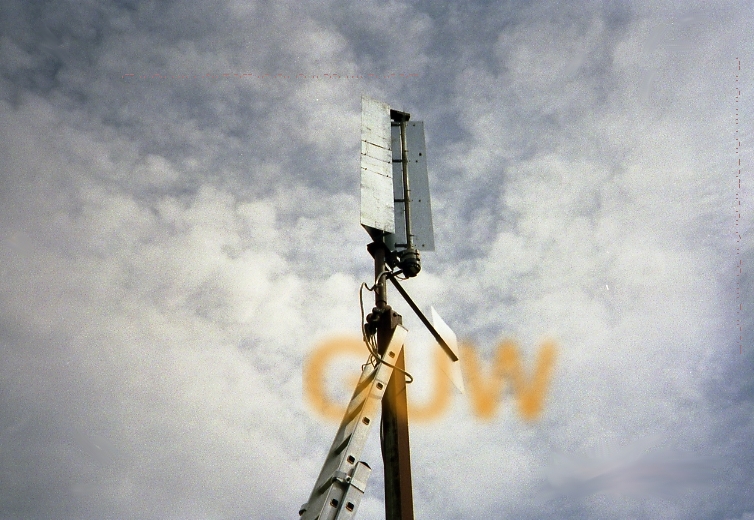 This machine is really a wind version of a water wheel. The wheel itself had four 'paddles' and was about 6 inches in diameter. It was quite long though, about six feet, and was supported by a bearing at the top and a car alternator at the bottom. The machine is shielded on the left to allow the wind to pass without slowing the paddle coming towards the wind, with an angled guide feeding the wind to the paddle travelling in the same direction as the wind. It was another in a long line of experiments to try and achieve a high shaft speed without using a gearbox or pulleys etc. It worked well in high wind but produced nothing if the wind was less than 20mph. Very noisy and not practical at this size, although I do understand that scaled-up versions that are enclosed in a housing are very effective. My objective was to find a design of machine that was cheap and could produce at least a charging current for batteries at low wind speed, and significant power during storms.